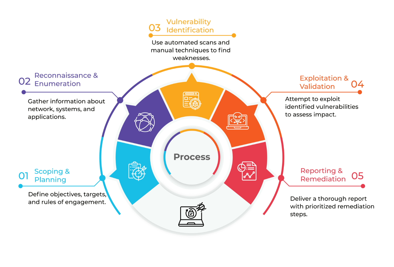 Our Penetration tests follow a structured process designed to uncover vulnerabilities before attackers do. Each phase plays a critical role in ensuring a thorough and ethical assessment of your systems.